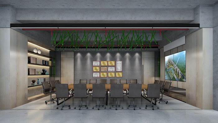 會議室效果圖:整個會議室呈長方形分布,會議室位于整個空間的中間,左右前后都有一定的預留間距,前邊為投影儀,后邊為展示區,左邊為企業榮譽,右邊與外界空間相連。