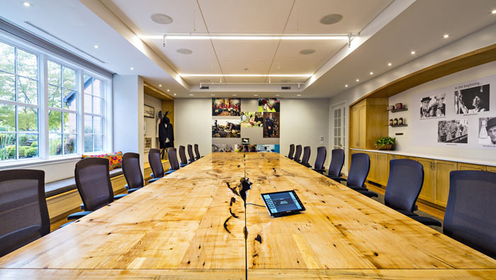 辦公會議室裝修效果圖:會議室安置在落地窗的一側,這樣做的目的就是希望將室外引入室內,設計師希望通過室外彌補室內的不足,由此達到空間的平衡。