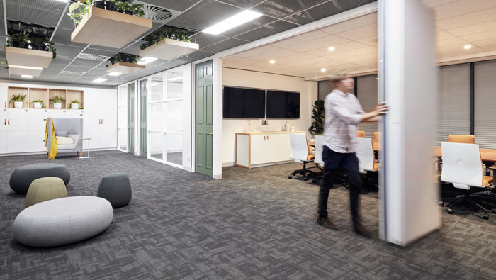 辦公會議室裝修效果圖:自然、簡潔是空間的設計主題,推拉門的設計為空間釋放了更多的區域,推拉門關閉時可以作為隔墻使用,開放式封閉的空間與外部空間合為一體。