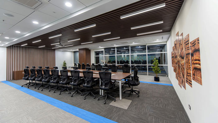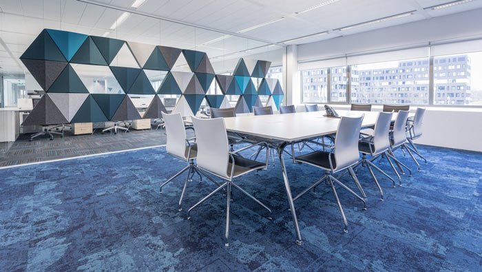 辦公會議室裝修效果圖:由顏色框定的會議空間,正是設計師為企業專門定制的,這樣可以減少隔墻對空間的影響,斜放的會議桌椅,讓空間不會那么呆板。