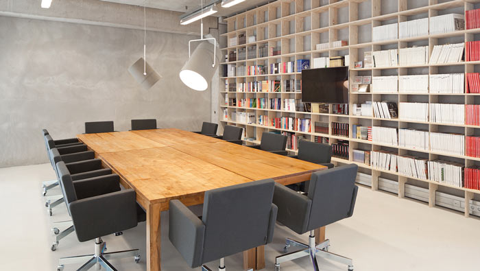 辦公會議室裝修效果圖:會議室、閱讀室是此處空間的兩大屬性,這是設計師希望將空間的使用達到最大化,閱讀讓人成長,會議室實踐解決問題,兩者之間和諧共處。