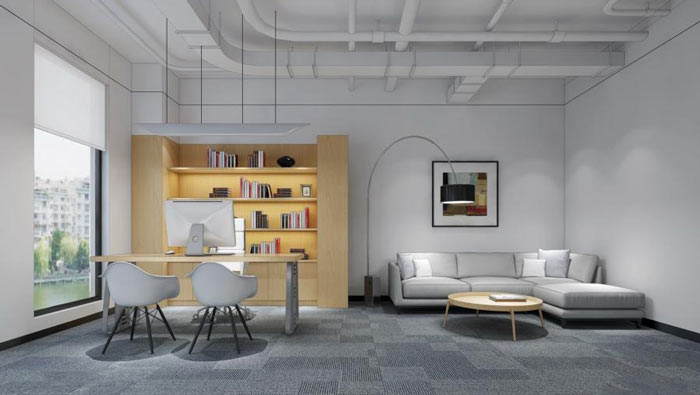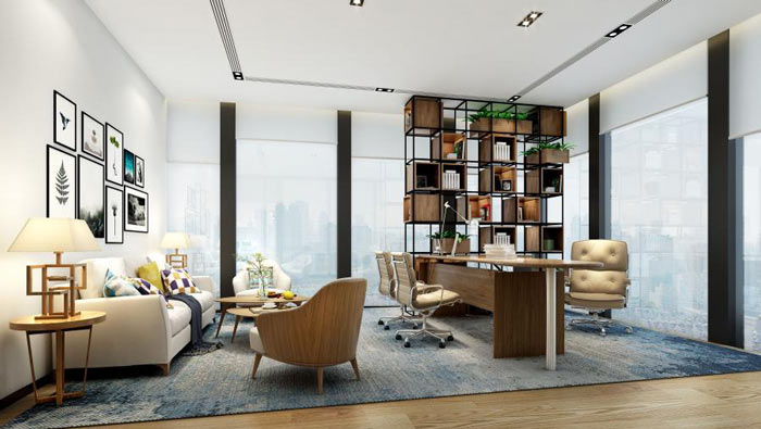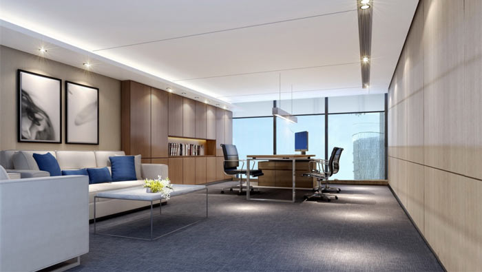 公司經理辦公室設計:由于空間的面積有限,所以開放式是唯一的選擇,設計師利用地毯代替了墻體,一切設計都在這方寸之間展開,有了界限,一切設計都有所依照。