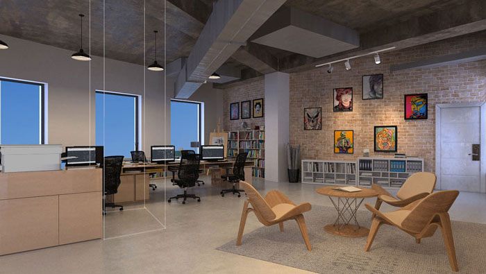 在廠房辦公室前臺的設計過程中,設計師采用工業風+極簡的兩種設計風格對空間進行設計,在設計的同時設計師將空間融入企業的里面與文化,以此完成空間與空間的搭配,空間與企業的搭配。
